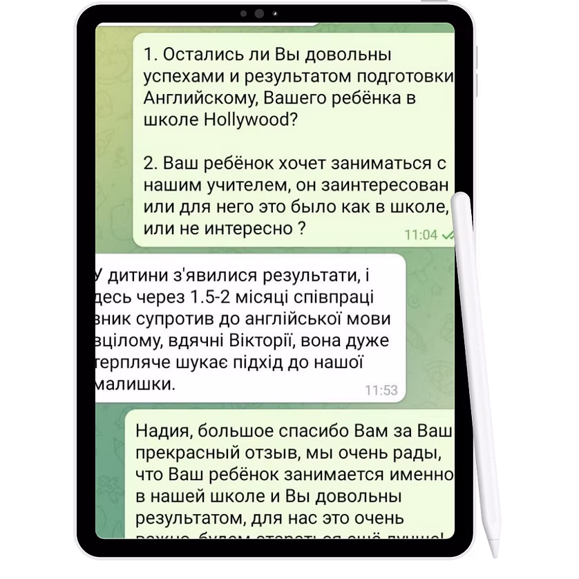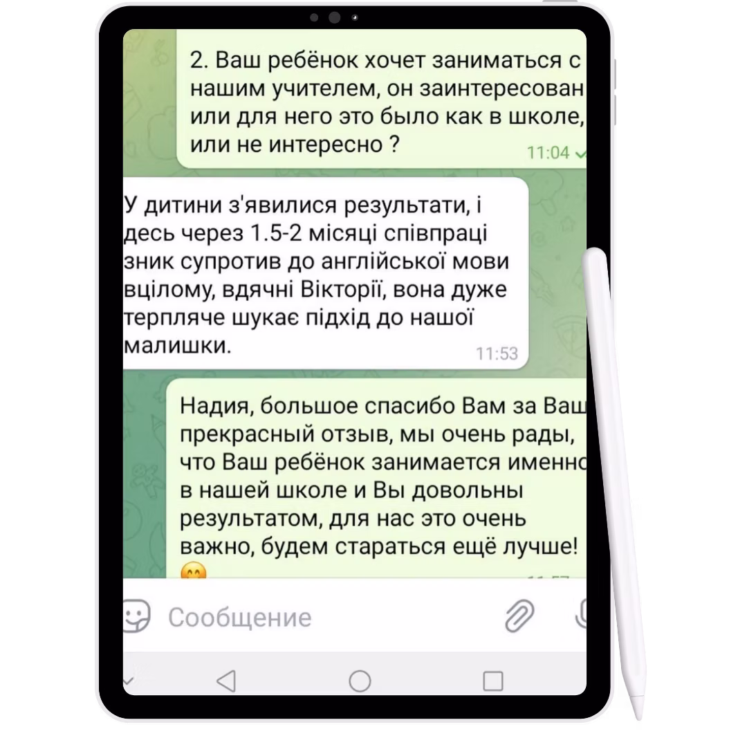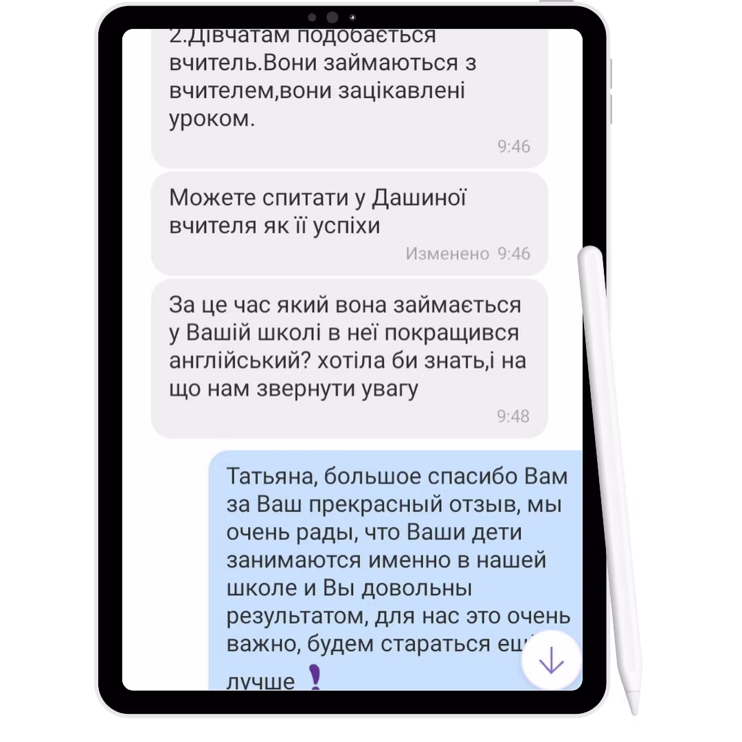 Для досягнення гарного результату наші викладачі використовують провідні методики всесвітньо визнаних навчальних закладів, психологів та педагогів. Уроки проводяться за допомогою сучасних сервісів відеозв’язку, таких як Google Meet, Zoom, тому кожен може вибрати зручний для себе спосіб.